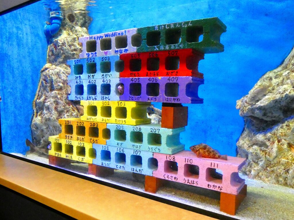 マンション風になったブロックにカサゴを代表する隙間が好きな魚たちが暮らしていたり、ユニークな掲示があったりしました。