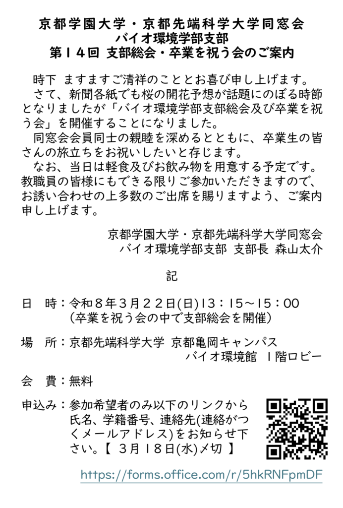 連絡が遅くなりましたが「第14回 京都学園大学・京都先端科学大学同窓会バイオ環境学部支部総会及び卒業を祝う会」を開催することになりました。